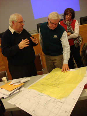 Reviewing police department blueprints at a Jan. 10 Cape Elizabeth council workshop, in hopes of finding a use for unused space in the building, are, from left, Town Manager Michael McGovern, Council Chairman James Walsh and Councilor Jessica Sullivan.