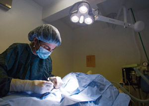 Dr. Beth Sperry performs the first surgical spay procedure of the day on a female German shepherd.