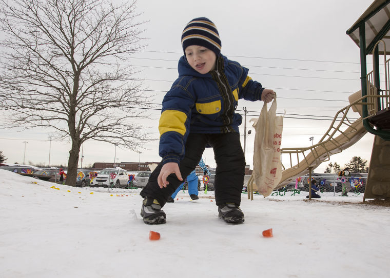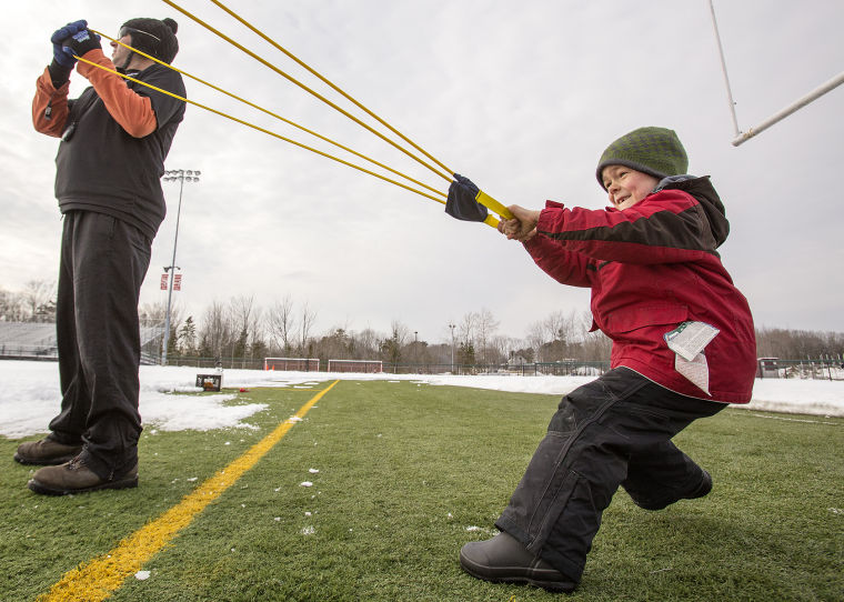 The snow sling event on the turf field was new this year, with participants launching a snowball for distance and accuracy using a powerful slingshot. Drew Noone, a Scarborough second-grader, gets assistance for his snowball tosses from Community Services Recreation Program Coordinator Ryan Colpitts, (left, and Recreation Manager Bill Reichl.