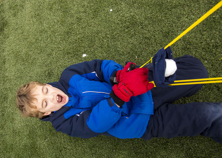 Nicholas Rayner, a Scarborough third-grader, goes to the turf to get a full stretch on the slingshot during the snowball toss event.