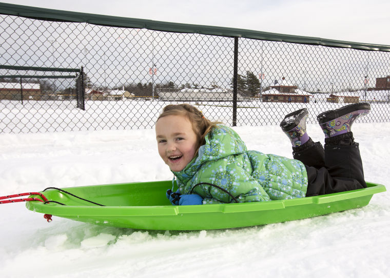 Kate Mokriski, a Scarborough pre-schooler, enjoys her role as cargo in the human dog sled race, as her sister, second-grader Kate, tugs her down the race course.