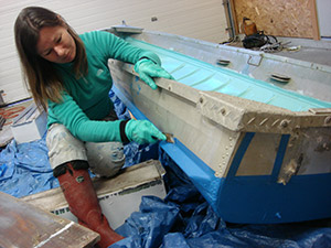Abigail Carroll, owner of Nonesuch Oysters, a 2009 aquaculture startup based at a leased sea farm on the Scarborough River, preps one of her boats for the coming season, which will see more than a million oysters in production.