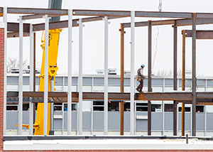 Despite the cold, work continues on the $47.3 million renovation to South Portland High School. On Monday, a worker, top, treads carefully on an exposed roof area.According to Superintendent Suzanne Godin, work on the project, slated to last through 2014, is 10 days behind schedule. However, she notes, workers from PC Construction started a month behind as the building committee scrambled to bridge a $4 million gap between the $39.26 million budgeted for construction and PC’s $43.24 million low bid. To date, she said, the project has tapped about $400,000 from a $2 million contingency fund, largely to tackle unexpectedly difficult work digging into ledge. If anything remains when the project is over, she said, it may be used to add in some of the late cuts, including equipment for the buidling’s auxiliary kitchen. To date, the walls have gone up on the new cafeteria and auditorium, while the next step will be the three-story addition connecting the new section to Beal Gym. However, the best thing about the project so far, according to Principal James Holland, is that, “there has been remarkably little disruption to the students.”