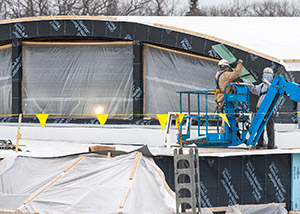 Despite the cold, work continues on the $47.3 million renovation to South Portland High School. On Monday a load of windows for a row of skylights arrives on a Genie Lift on what will be the roof of the new cafeteria.According to Superintendent Suzanne Godin, work on the project, slated to last through 2014, is 10 days behind schedule. However, she notes, workers from PC Construction started a month behind as the building committee scrambled to bridge a $4 million gap between the $39.26 million budgeted for construction and PC’s $43.24 million low bid. To date, she said, the project has tapped about $400,000 from a $2 million contingency fund, largely to tackle unexpectedly difficult work digging into ledge. If anything remains when the project is over, she said, it may be used to add in some of the late cuts, including equipment for the buidling’s auxiliary kitchen. To date, the walls have gone up on the new cafeteria and auditorium, while the next step will be the three-story addition connecting the new section to Beal Gym. However, the best thing about the project so far, according to Principal James Holland, is that, “there has been remarkably little disruption to the students.”