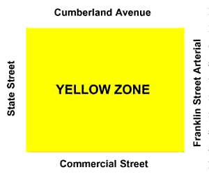The parking ban will be in effect within the “yellow zone” – the downtown business district bounded by Commercial Street on the south, Cumberland Avenue on the north, Franklin Street Arterial on the east and State Street on the west.