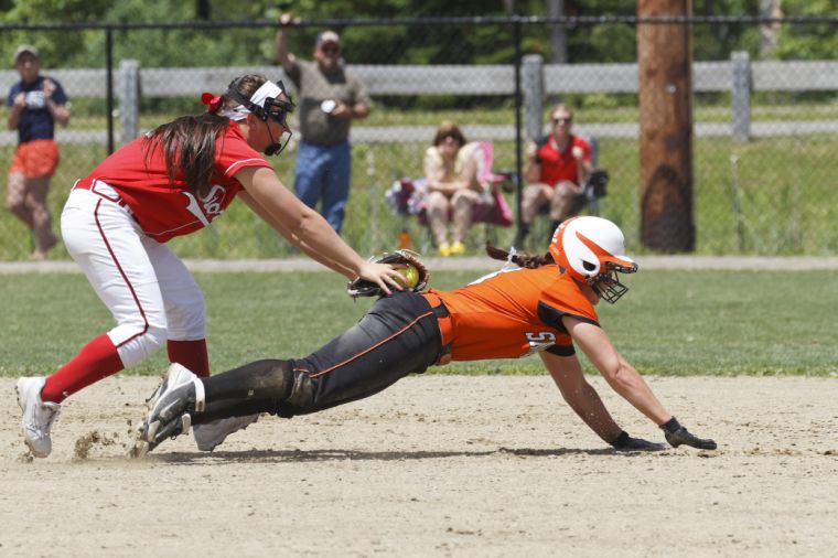 Scarborough third baseman Erin Giles runs down a Skowhegan player on her way back to second.
