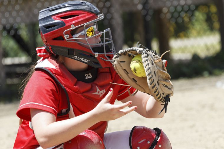 Red Storm catcher Megan Murrell flips the ball from her glove to her throwing hand.