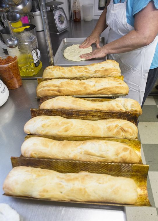 Chef Laura Butler prepares a pizza while loaves of fresh bread await slicing at Enio’s Mediterranean Eatery on Cottage Road.