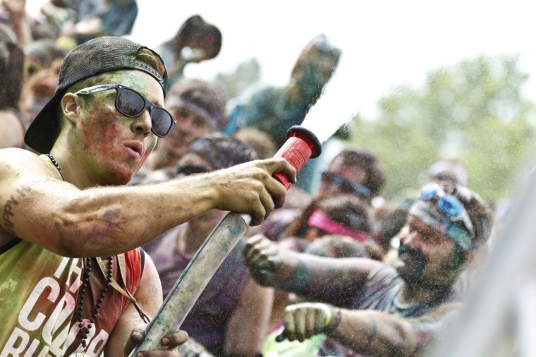 Brandon Trump hoses down the happy Color Runners – but not to clean them off; just to prep them for the next color throw.