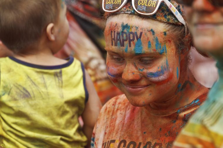 The Color Run is an emotional endeavor, both a social and an inward journey in search of positivity. It bills itself as “the happiest 5K on the planet,” and happiness is squarely the focus. Color Runners plaster themselves in temporary tattoos reading simply “HAPPY,” and they cover the course at exactly their own pace – no official times are kept; it’s not a race at all, except for those Color Runners who wish to time themselves or one another. They hear encouragement as they pass each kilometer, where volunteers lining the path thoroughly dust them with brightly colored (but non-staining and non-toxic) corn starch powder. And most hang around after they finish, flooding to the front of a stage where Color Run employees spin dance music, announce “color throws,” and fire off T-shirts and other swag into the crowd.
