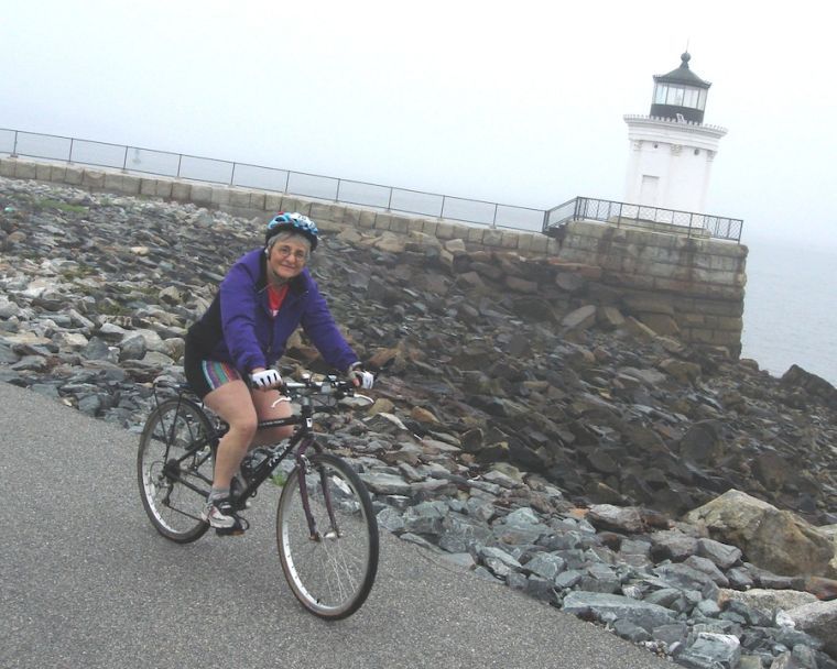 Rosemarie De Angelis, chairwoman of South Portland’s bicycle/pedestrian committee, rides her own bike past Bug Light. On July 17, South Portland’s assistant city manager, Jon Jennings, will appear before De Angelis’ group to unveil a proposal for a new “bike share” program that could be launched citywide next spring. Staff photo by Duke Harrington