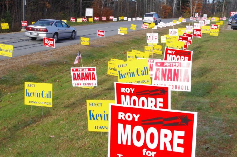 Windham voters navigate through a sea of campaign signs on the way to voting at Windham High School on Tuesday morning. Voters effected a sea change of sorts by defeating two incumbents and electing two former councilors.