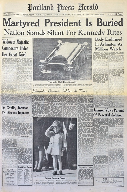 Most schools, businesses and government offices were closed on Monday for JFK’s funeral and burial. Many churches held local services and students of parochial schools attended Mass. On Tuesday, the Press Herald carried a fervent banner headline, “Martyred President Is Buried,” above photos of Kennedy’s casket and little John-John’s heartbreaking salute.