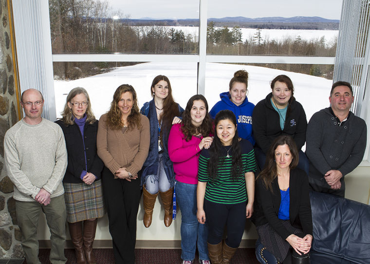 With the frozen expanse of Sebago Lake glistening in the background, some of the approximately 150 members of the Saint Joseph’s College community who have signed a petition opposing plans to bring tar sands into Maine gather in the Alumni Lounge in Alfond Center. From left are Greg Teegarden, Nancy Kristiansen, Jeanne Gulnick, Maria Liberti, Cassie Theriaque, Nhu Vo, Michelle Rocker, Allisha Yandian, Kimberly Post (bottom) and Stuart Leckie.