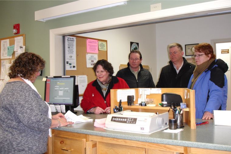 From left, Deputy Registrar of Voters Sharlene Myers checks over a stack of signed petitions submitted by residents Kathleen Potter, David Hilton, Steve Hathorne and Penny Hilton at the New Gloucester town office on Feb. 3.