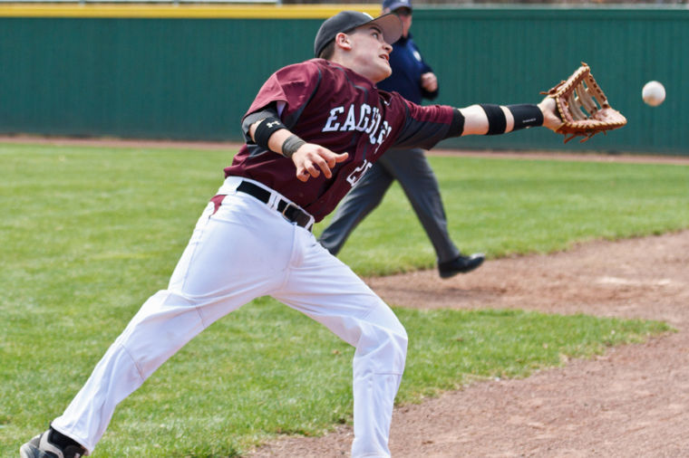 Eagles first baseman Zach Alpern can’t quite reach a fly-foul ball.