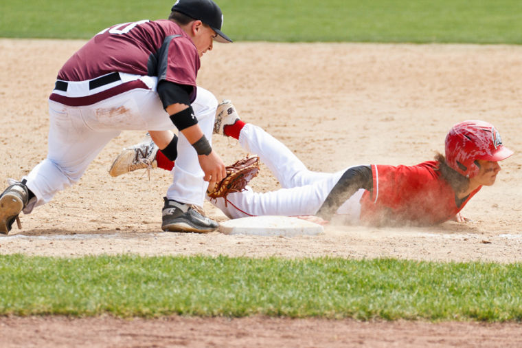 Spartan Jimmy Parks (11) narrowly gets second on a base hit into center by teammate Tyler Flayhan (8).