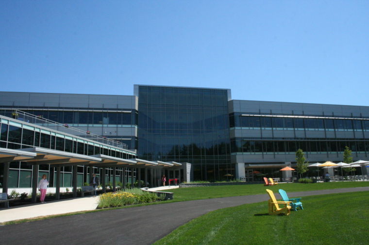 The three-story building boasts a combination of workspaces that employees can choose to work from throughout the day, as well as a first-floor wellness center with fitness rooms, a walk-in medical clinic and large cafeteria.
