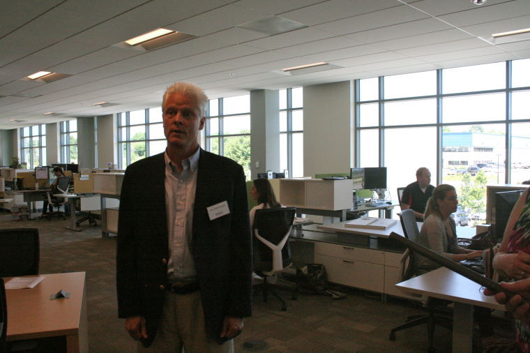 Jim Polewaczyk, an Idexx corporate vice president, guides guests through the company’s new bulding Friday following a ribbon cutting. Polewaczyk said the open environment allows for “a much higher level of productivity.”