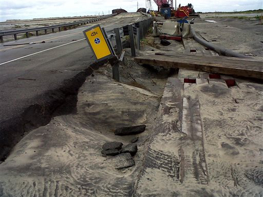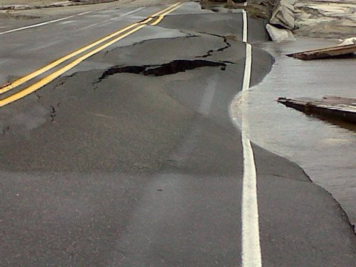 At the height of the storm, more than 40,000 people lost power, and the rush of water from the ocean on one side and the sound on the other side buckled part of North Carolina Highway 12 in a spot on Hatteras Island that was breached in Hurricane Irene in 2011. Dozens of workers were heading to fix the highway, and the Department of Transportation said it was confident the road would reopen Saturday as long as an underwater sonar test of a key bridge showed no problems.