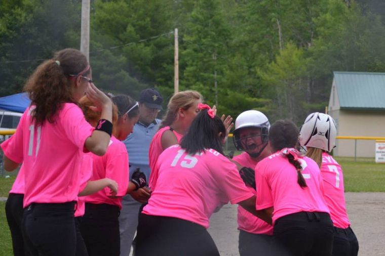 The Rayham Mayhem swarm Dani Tardiff as she reaches home after belting a ball out of the park.