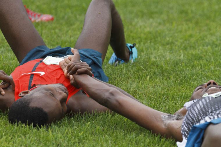 First and fourth place winners Bedan Karoki Muchiri (left) and Patrick Makau, both of Kenya, collapse on the grass and clasp hands after crossing the finish line.