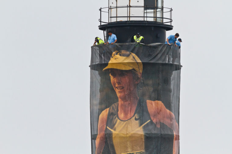 With the 30th anniversary of Joan Benoit Samuelson’s Olympic victory approaching, this banner of her decorated Portland Head Light during Sunday’s Beach to Beacon 10K.