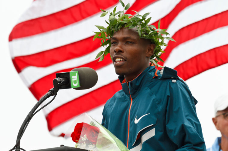 Kenya’s Bedan Karoki Muchiri, 23, speaks to the crowd upon receiving his laurels. Muchiri finished first among all runners, in a guntime of 27:37 – or a pace of 4:27 per mile.