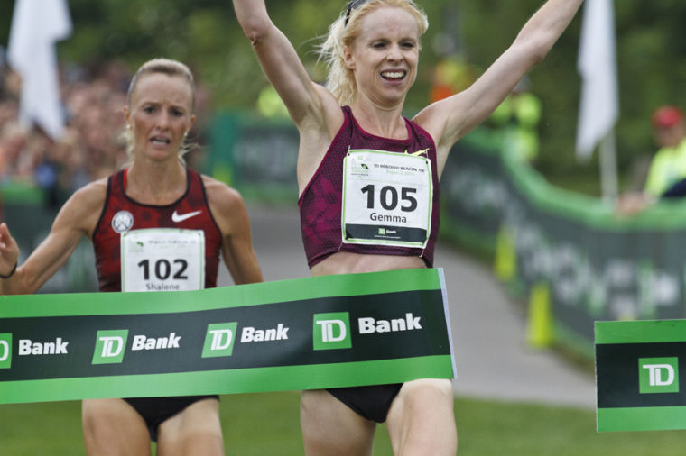 England’s Gemma Steel (105) breaks the tape, taking first among all women just a half-step ahead of American Shalene Flanagan.