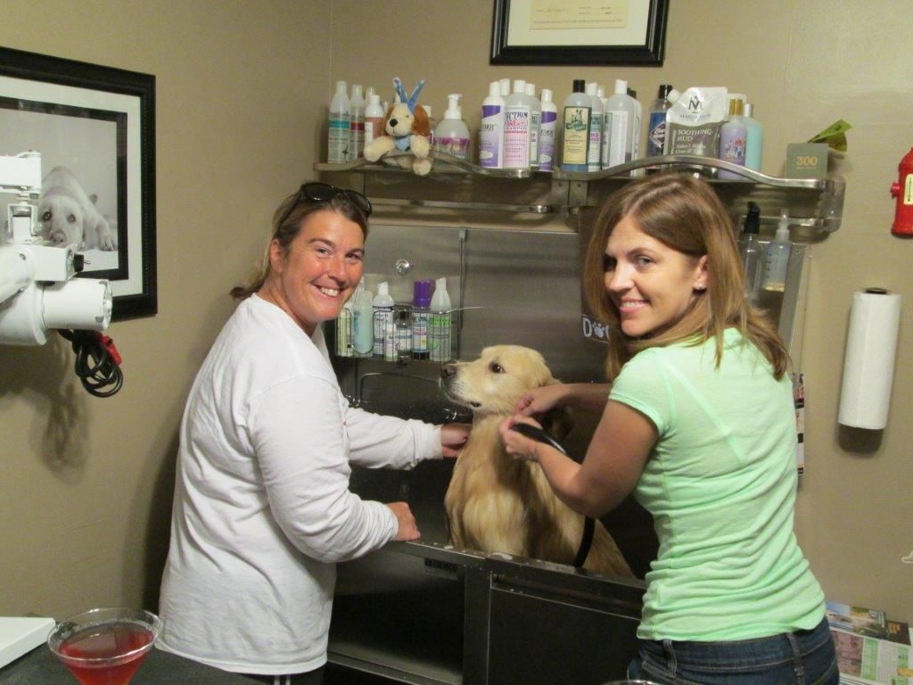Jamie Gaudreau, left, and friend Marcie Flores, give Ruger a bath Wednesday night. Ruger, owned by Gaudreau, went missing three weeks ago. Flores, the owner of Heaven Scent Grooming in Gorham, provided the complimentary bath.