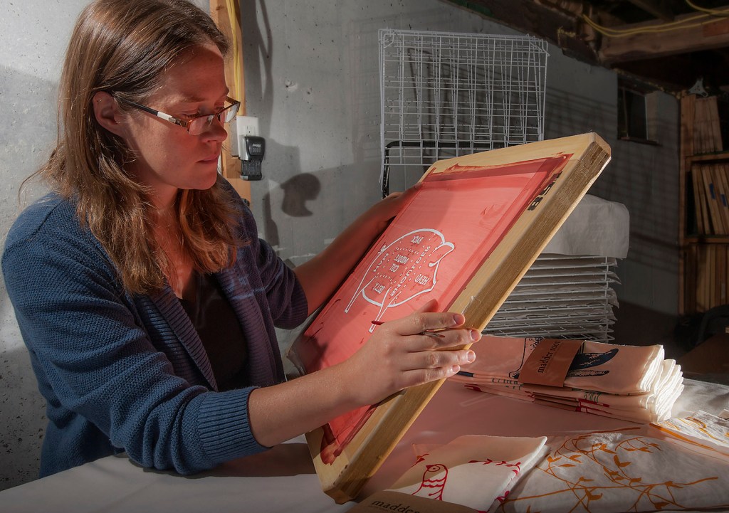 The Madder Root linens were so popular that they’d leave the fair at the end of each day and go home to Old Town to make more product. “I was up until 4 o’clock in the morning, going, ‘what can I iron?'” Lannan remembered. “‘What can I pack?’ That was the only way we would have stuff to sell the next day.” One of her biggest contracts, with Conklin’s Maine Mercantile in Belfast, came about after the owner saw Madder Root at Common Ground, she said. Now she has 2.5 employees, including her husband (she bought her former partner out). A deal with Anthropologie last summer was flattering but for Lannan, keeping it local is her preference.