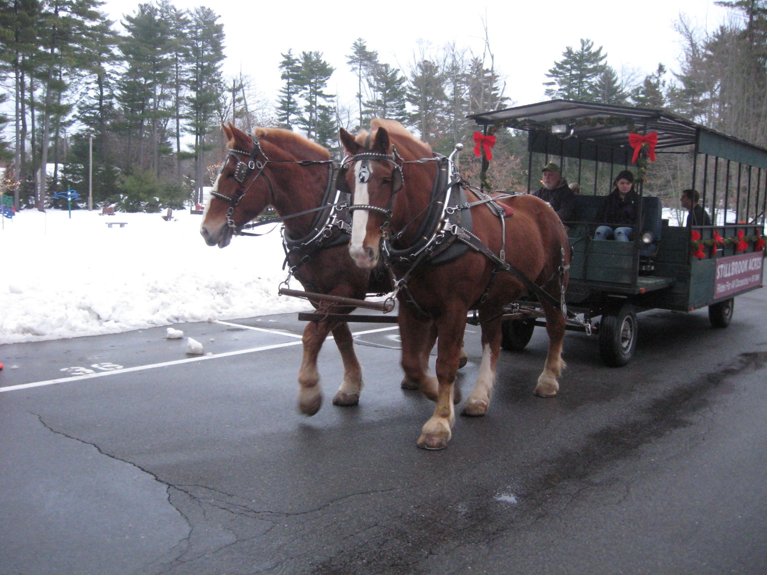While families waited for Santa’s arrival and lighting of the town’s holiday tree, Barney and Jim, weighing a ton each, provide horsepower for carriage rides on Sunday in Gorham. The team is from Stillbrook Acres in Gray.