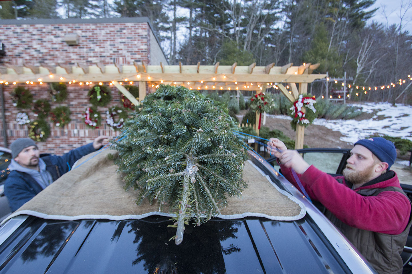 Nathan Sawyer, left, and Dustin Jordan team up to tie a newly selected Christmas tree to the roof of a customer’s car at Studio Flora in North Windham on Tuesday. Businesses such as Studio Flora, one of many along the busy Route 302 corridor, are hoping the local chamber’s buy-local campaign adds to their holiday cheer this month.