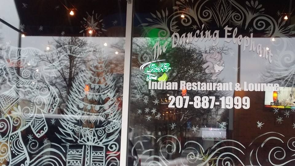 A portion of the Dancing Elephant’s holiday decorated window, designed by henna artist Mary Schmaling. The restaurant’s efforts brought it first prize in the first Downtown Westbrook Coalition window-decorating contest.