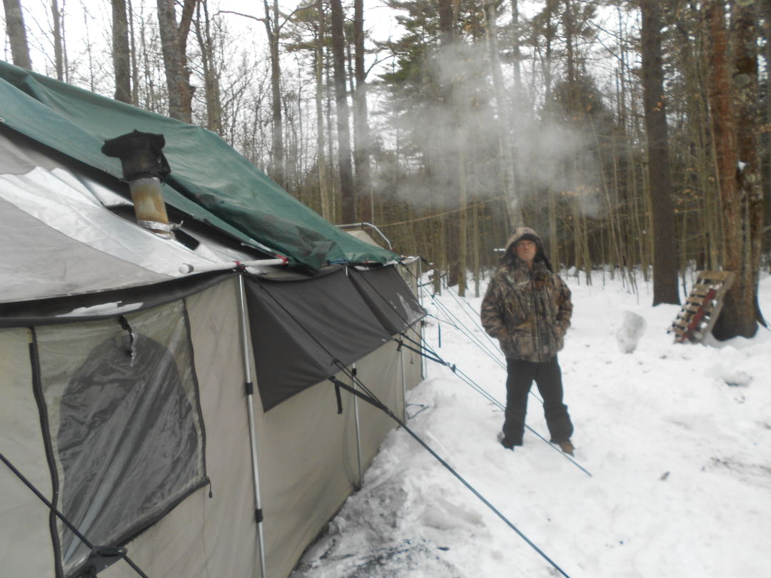 Ed Warden is staying in his big tent for the winter at the Bradbury Mountain State Park campground in Pownal mostly because he can.