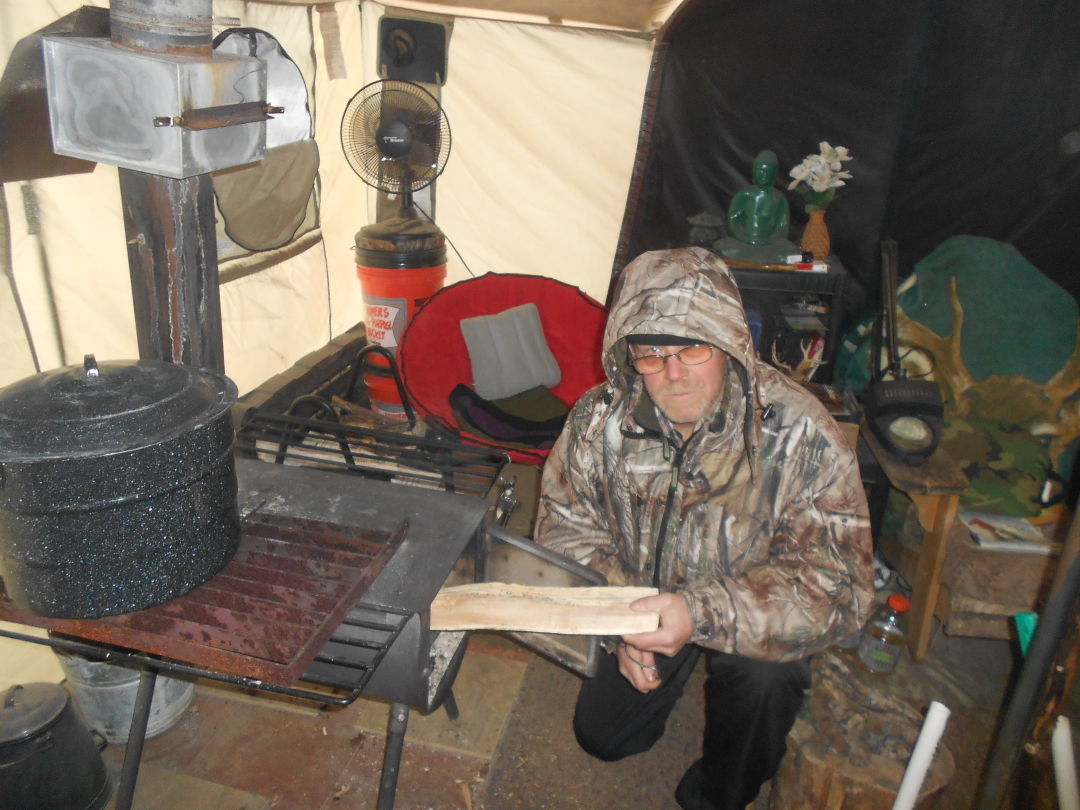 And chop wood Warden must, in order to keep his tent, which measures 12 feet by 20 feet, warm enough to live in this time of year. He has wood delivered in a truck, then splits it. Warden figures he’ll burn about a cord a month in winter, less in early spring. He burns the wood in a small wood stove, which he also uses for cooking. The vinyl floor, which consists of a liner, was built for use in a tent, Warden said.