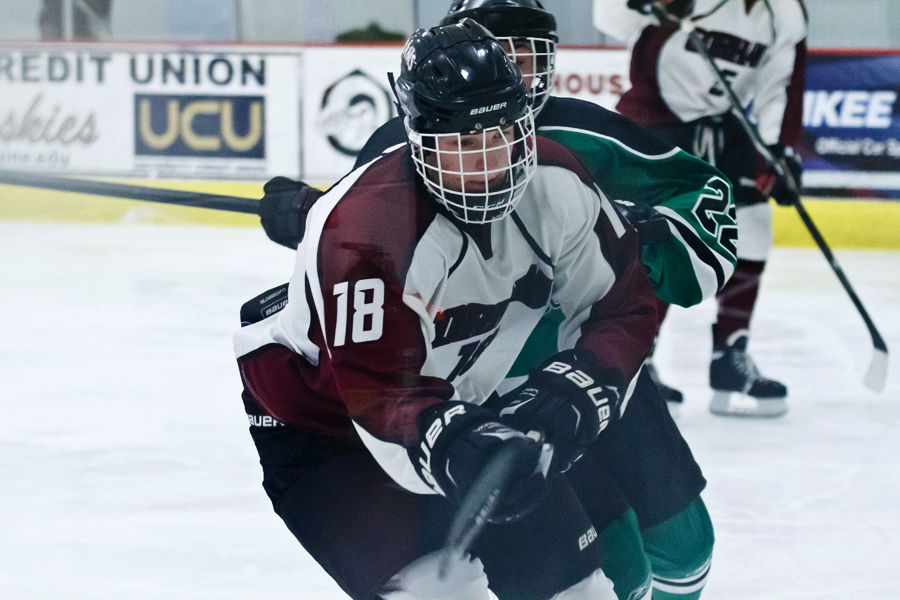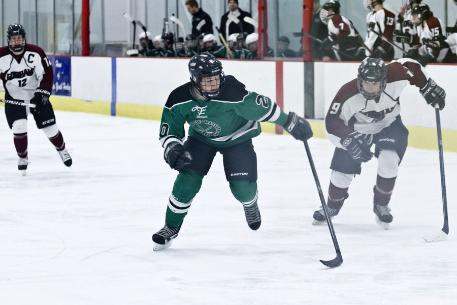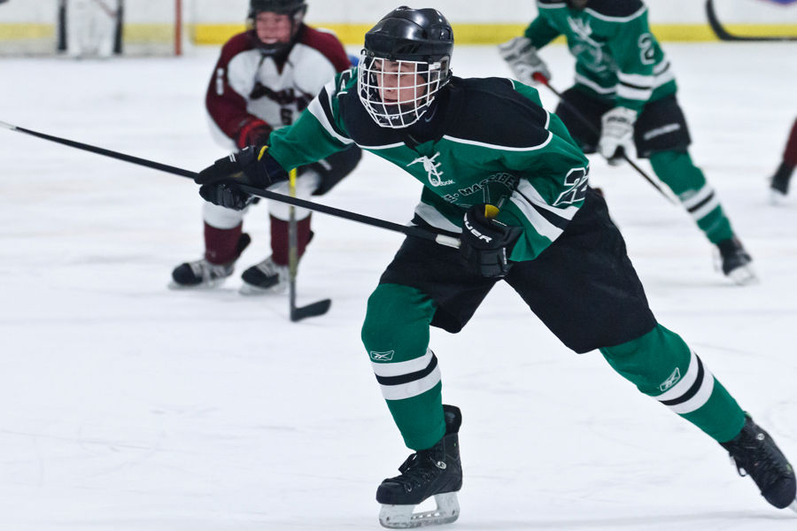 Bonny Eagle’s Robbie Axelsen dashes up ice; Gorham’s Nate Harvey follows hot on Axelsen’s heels.