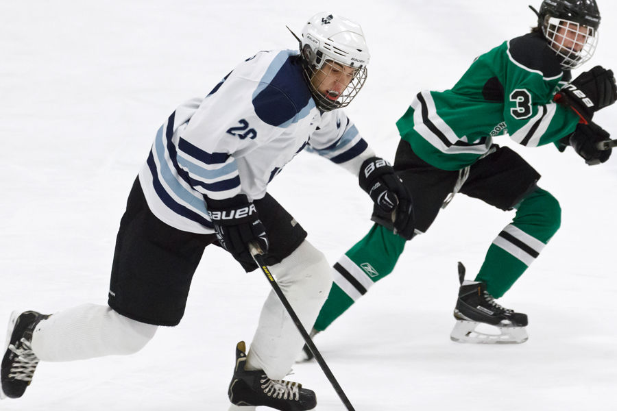 Justin Miles (Bonny Eagle) shoots up-ice against Westbrook Monday afternoon. Miles’s team – the so-called Mob of Bonny Eagle, Massabesic and Old Orchard Beach – overcame the Blazes 3-1.