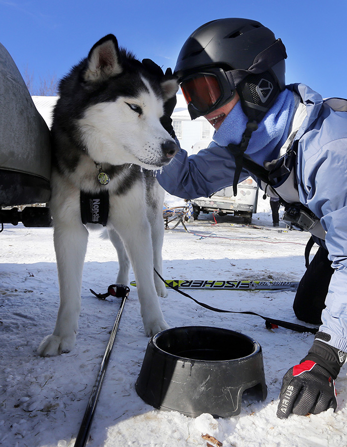 Meyer drove all night from her home in Garfield, New Jersey, to race with her dog, Filou, a 7½-year-old husky, in skijoring events during the two-day bowl. In skijoring, the dogs pull a person on skis rather than on a sled.