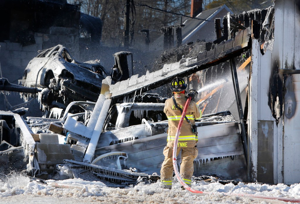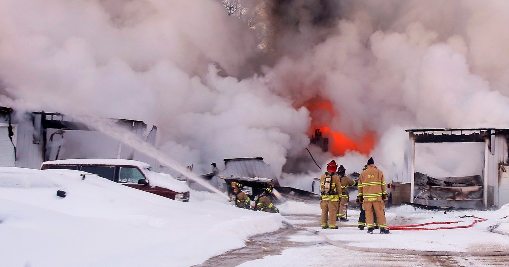 “Once the firefighters introduce water, it runs everywhere and it freezes tight,” Rowe said. While firefighters battled the fire, public works crews spread sand around hoses and other areas that had become slippery, he said.
