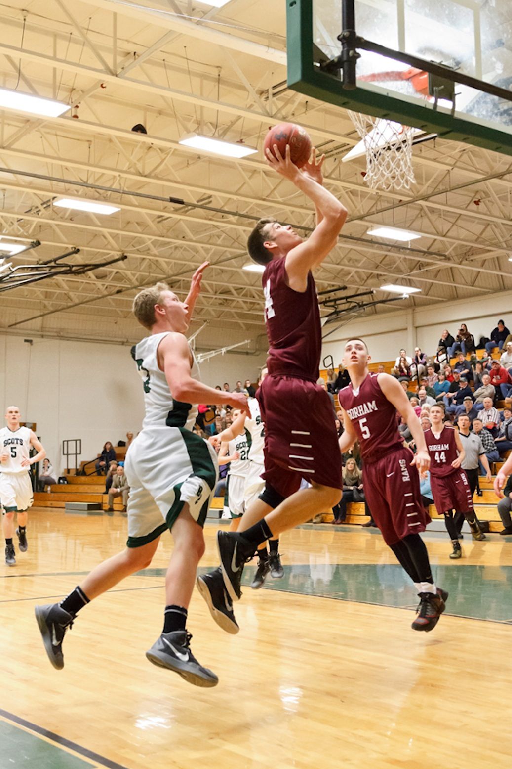 Troy Bogdahn knocked down a two to begin the second quarter, but Gorham’s Cam Smith followed it up immediately with four of his own; Ben Malloy then grabbed a two only for Billy Ruby to answer with another pair of twos, the second of which came on a beautiful, blunt steal as Malloy tried to inbounds the ball beneath the net. By the break, the Rams led 35-21.