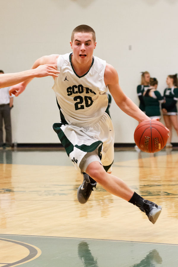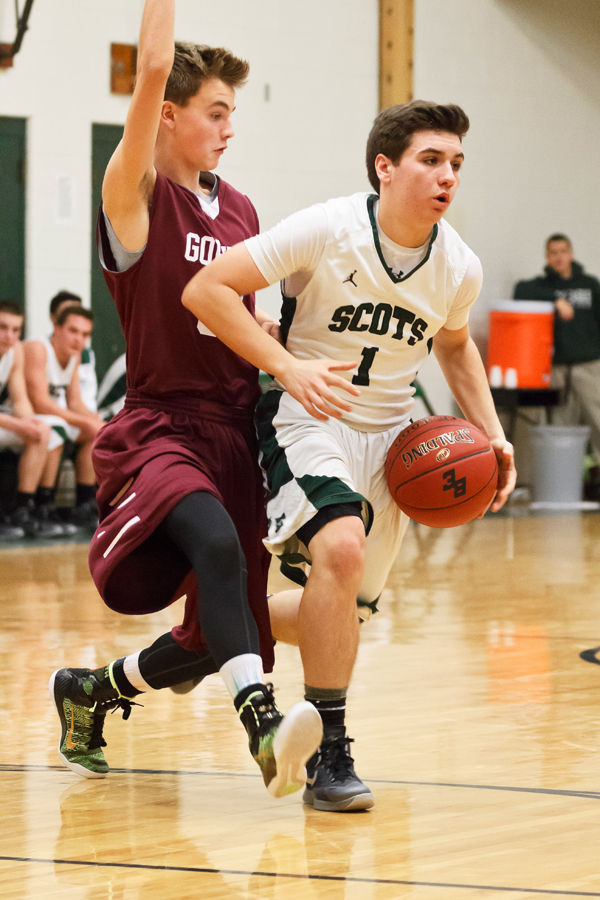 Nick Thibeault outsizes Dylan Ricci on his way to the basket; Thibeault had 18 for the Rams in their win over the Scots.