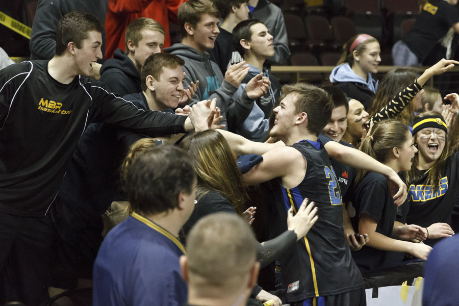 Quinn Piland visits his fan contingent on his way off the court after Lake Region’s 52-50 win over Yarmouth in the tournament semis.