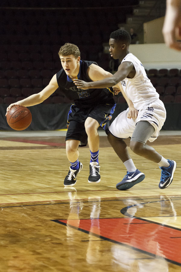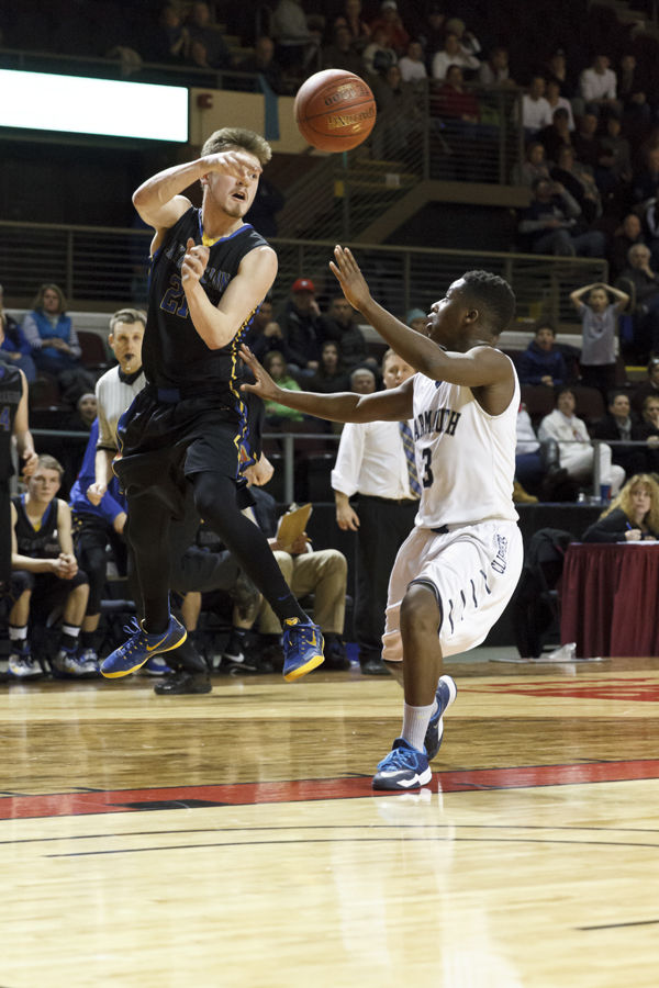 Quinn Piland dishes over Musseit M’Bareck of Yarmouth. The spectacular pass – mid-air, over the shoulder – is representative of Lake Region’s machine-gun ball movement.
