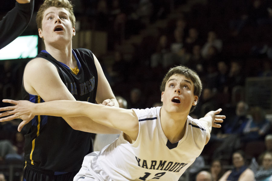 Lake Region’s Nick Hall and Yarmouth’s Adam Clark wait for a free-throw attempt to fall or miss.