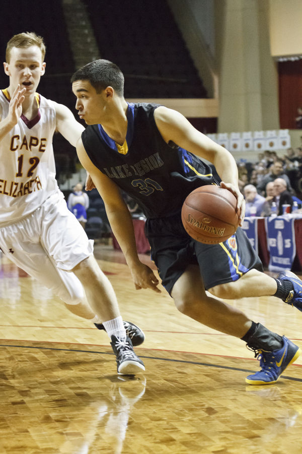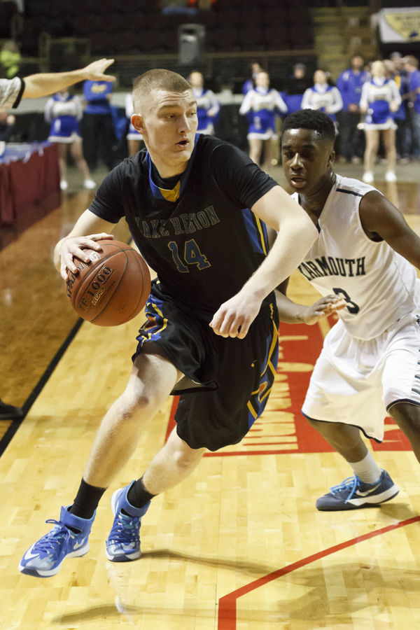 Nate Smith drives for Lake Region in their Regional Final vs. Cape Elizabeth. Smith had 11 points in the loss.