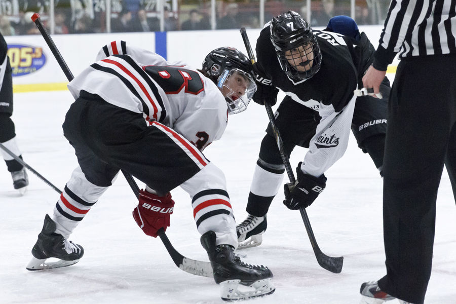 Storm center Jack Callahan faces off with St. Dom’s Austin Roy in Saturday’s State Final.