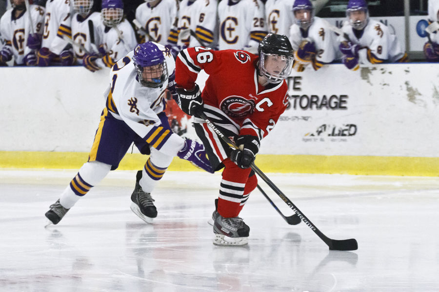 Scarborough defenseman Eric Murray keeps just ahead of a St. Dom’s attacker through the corner on Saturday.