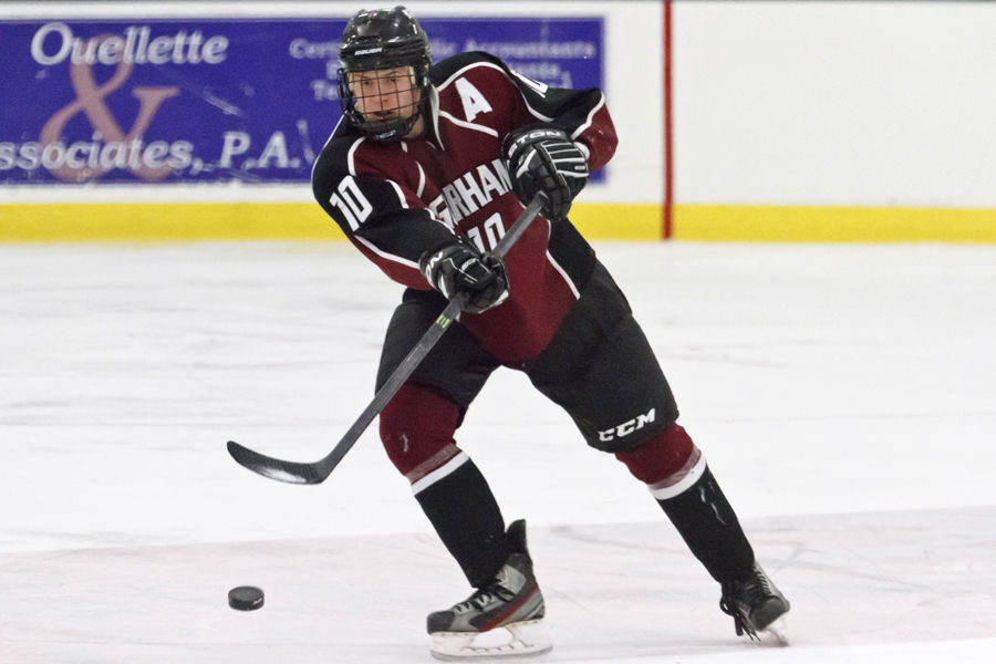 Gorham defenseman Andrew Schmidt flips the puck forward during the Maine Winter Classic, held Saturday night at Norway Savings Bank Arena in Auburn.