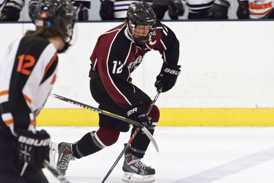 Yarmouth’s Brian Travers carries the puck forward on the attack for the East in Saturday night’s Class B game of the Maine Winter Classic.